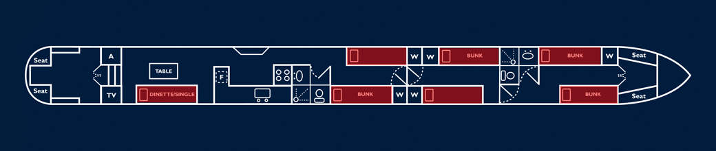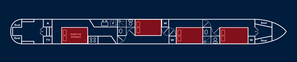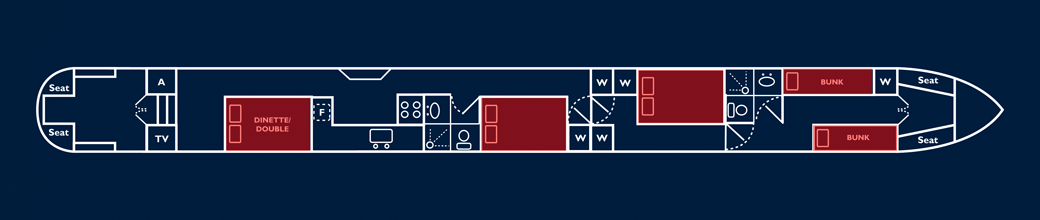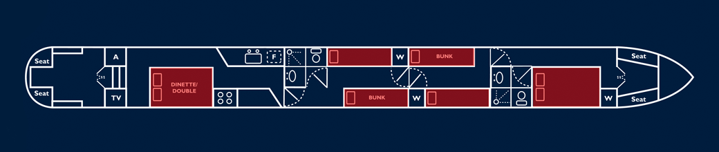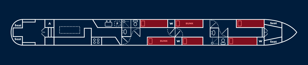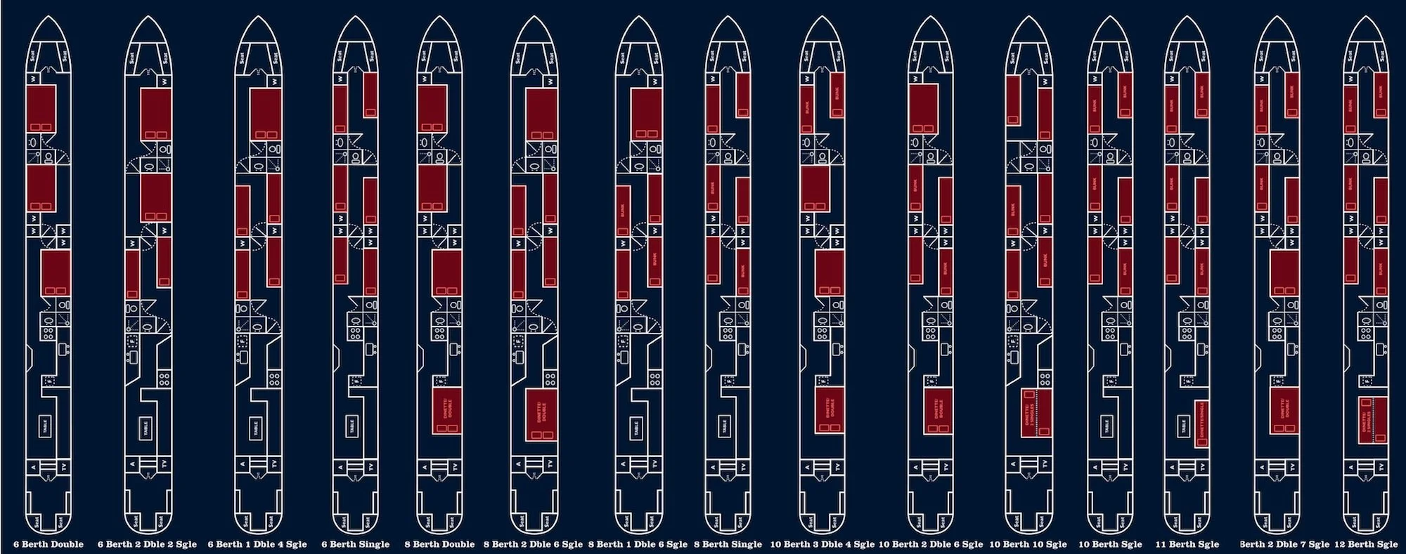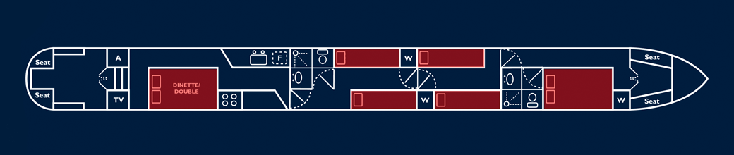 The layout of these holiday boats is almost infinitely flexible. They offer a multitude of options from supremely comfortable cruising in private twin/double cabins for 6, permanent double/single berth combinations for 8 right through to a capacity of 12 for a larger family, party cruise, or group of friends. Any combination of the above may be possible! - When the dinette is being used for large parties, 2 singles may be laid out as two people on the dinette top-to-toe, as shown.